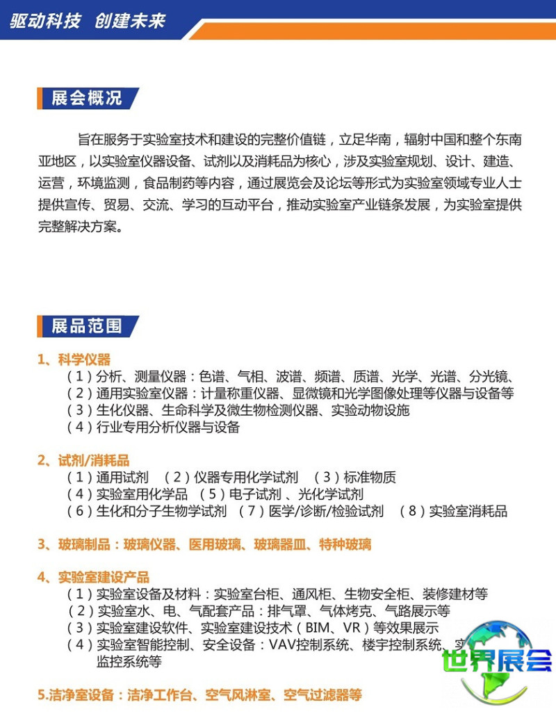 广州国际分析测试及实验室设备展览会(CHINA LAB)以推动科技进步、追求精准科学为宗旨,秉持以人为本的服务理念,执行严格科学的运作程序,推行高效务实的管理模式,旨在为广大的实验室及相关领域的生产商与用户构建一个高效、实用的交流平台,营造一个轻松、融洽的商务洽谈环境。