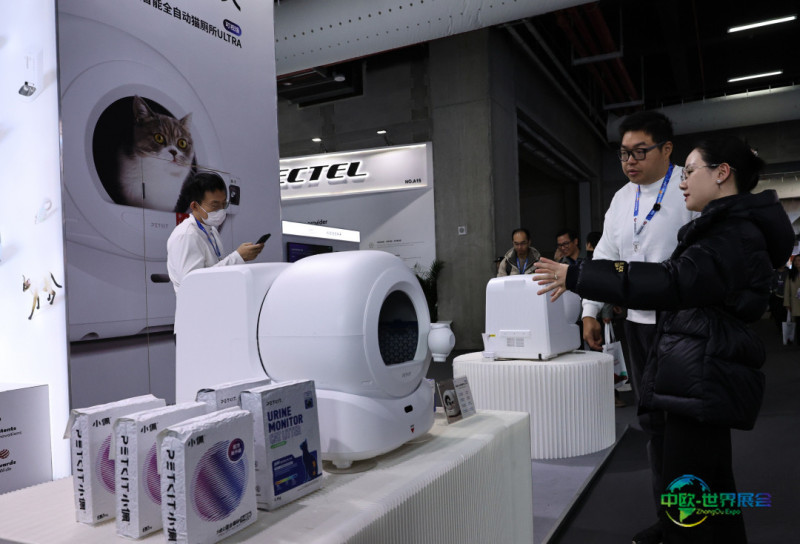 3月12日,几位参观者在一款智能猫厕所产品展位前交流看法。新华社记者 方喆 摄