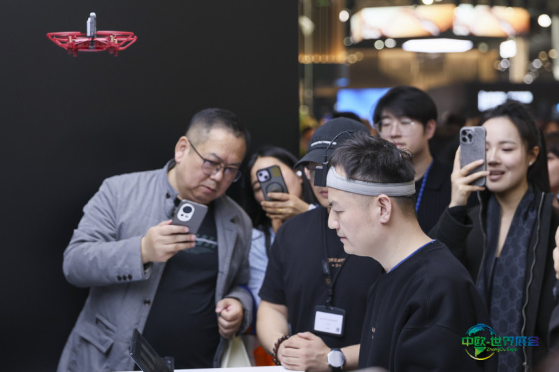 3月12日,在上海新国际博览中心追觅科技展位的脑机接口展台,工作人员向观众演示如何通过脑电波操控无人机。新华社记者 王翔 摄