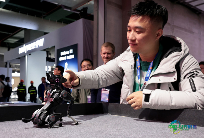 3月12日,参观者在东方枢纽展区与一只名为“哮天Sirius”的、公斤级可训练机器狗进行互动。新华社记者 方喆 摄