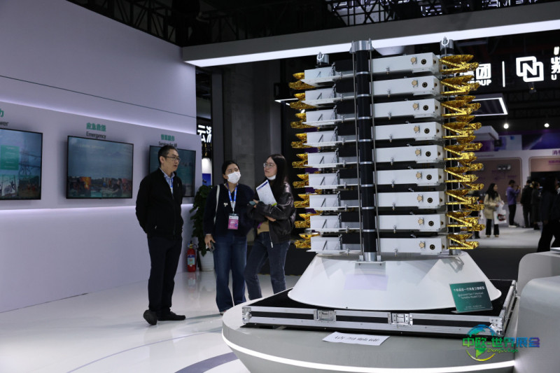 3月12日,参观者们在东方枢纽展区内展出的千帆星座一代堆叠卫星模型旁进行探讨。新华社记者 方喆 摄