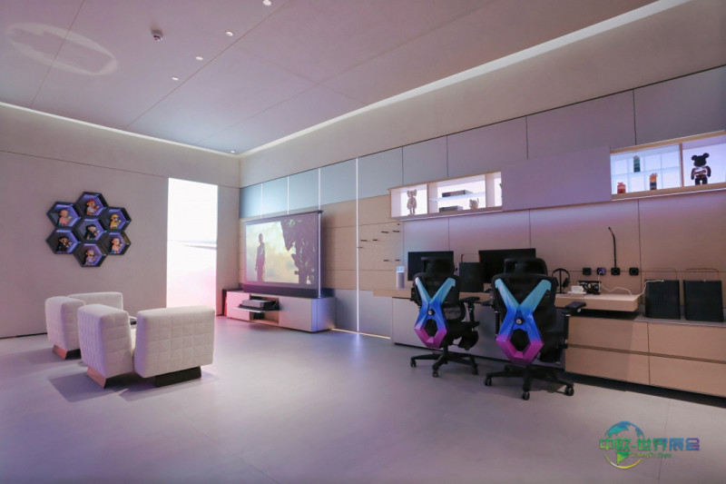 兴趣空间 | 次元宇宙的声光领域。这里是对Z世代多元爱好的高度致敬,电竞、观影、手办、运动等全部涵盖其中。立体灯光设计可组合多种情绪方案:骏逸模式下马术装备清晰可见;霆决模式下电竞区光影跳动,潮玩柜同步点亮。激光投影与幕布从柜内缓缓升起,“能量补给站”冰饮随手可得。洞洞板单孔承重20公斤,健身器材轻松悬挂;多巴胺背板随音乐律动,深渊镜线条灯光让潮玩成为空间焦点——这里是年轻人的声光领域,让思绪一键清空。