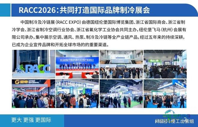 RACC 2026第六届中国国际空调通风与制冷及冷链产业展览会定于2026年10月22日至24日在杭州大会展中心举行。本次展会预估展览面积达50,000平方米,将汇集超过900家参展企业,吸引50,000余名专业访客,覆盖全球多个主要经济区域,是洞察行业动态、连接优质资源、促进商业合作的重要桥梁。作为CHILLVENTA全球网络的关键一员,RACC 2026将继续秉承德国纽伦堡博览集团的国际规范,紧密对接“双碳”目标与数字化变革潮流,为展商和观众构建一个融合技术呈现、趋势探讨与供需匹配的高端交流平台。