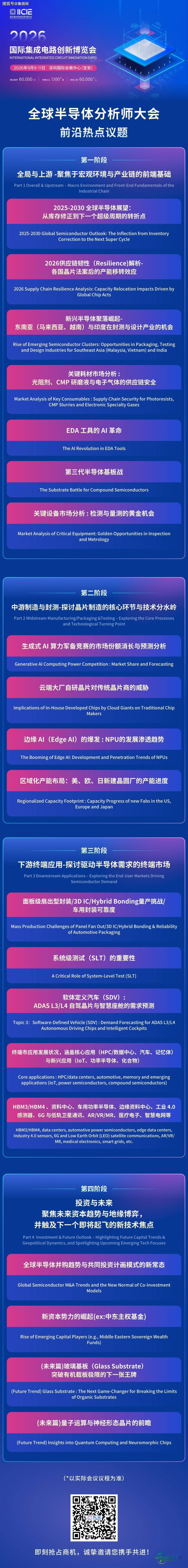 本届全球半导体分析师大会第二部分的“中游制造与封测”专场,背靠IICIE国际集成电路创新博览会的全产业链资源,不仅是一场凝聚全球智慧的专业研讨会,更是一次高效的资源对接盛会。参会者将有机会与全球顶尖分析师及行业专家进行直接交流,精准捕捉中游制造与封测领域的发展机会,破解企业运营难题,对接半导体全产业链核心资源,推动中游制造与封测企业协同创新、共同发展,助力产业链中游实现高质量转型升级。