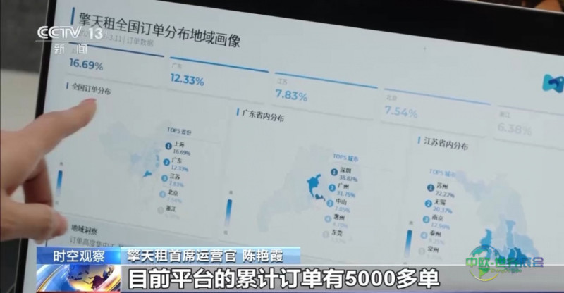擎天租首席运营官 陈艳霞:从订单大屏上可以看到,我们的业务正在上海、广东、江苏、北京、浙江等地全面开展。目前平台累计订单量已超过5000单。现在我们整体的订单已经排到了五一劳动节之后。