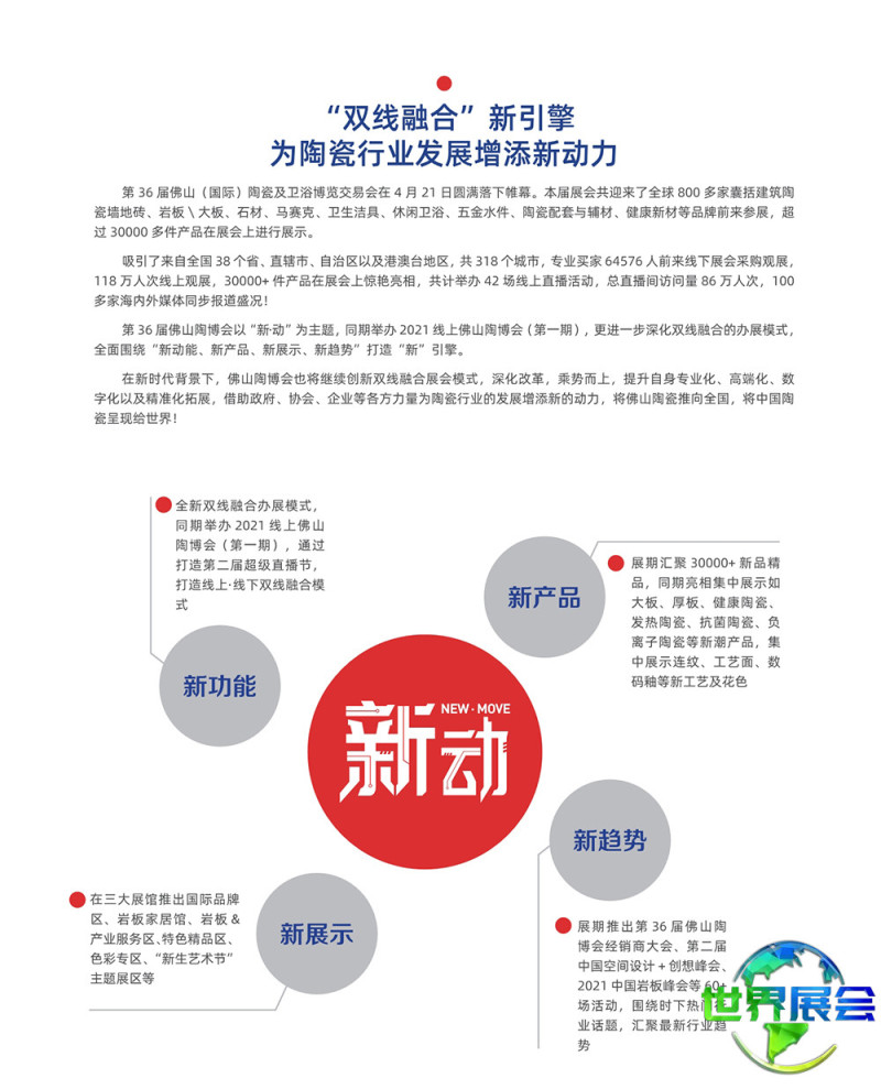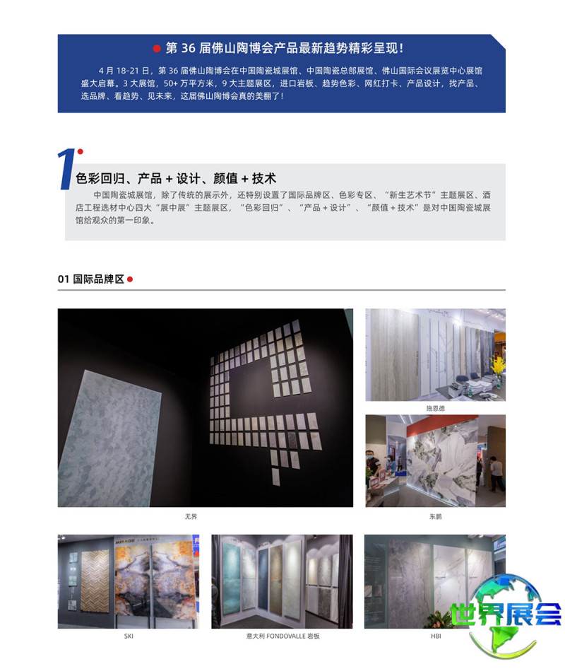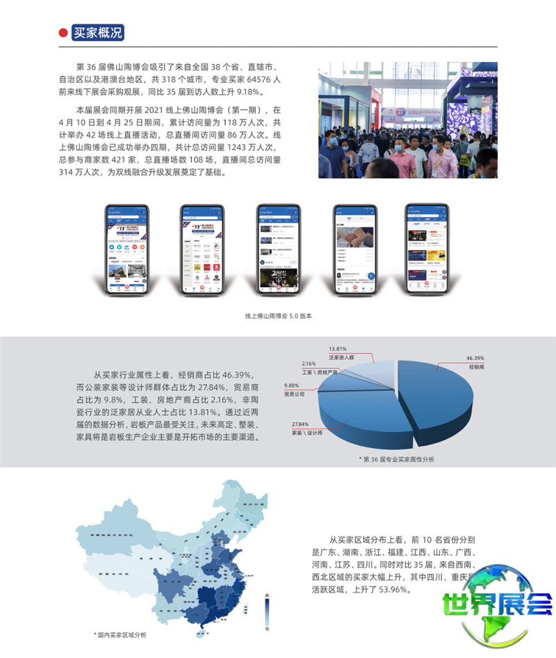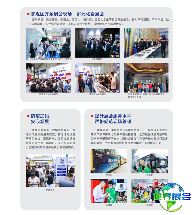 佛山国际陶瓷与卫浴博览会-佛山陶博会(CERAMBATH)在业内被广泛认可为继意大利博洛尼亚陶瓷卫浴博览会Cersaie、西班牙瓦伦西亚陶瓷卫浴展Cevisama、美国国际石材及瓷砖博览会Coverings之后的世界第四大国际性陶瓷及卫浴博览交易会。它是中国境内陶瓷及卫浴品牌参与度最高、规模最庞大、集聚效应最显著、专业权威性最强的行业盛会,是中国陶瓷与卫浴产品通向世界市场的重要门户。