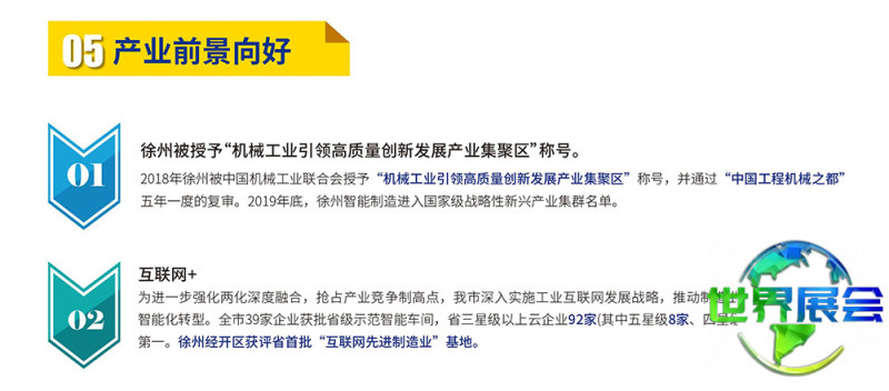 徐州国际工程机械博览会(CHINA XUZHOU)以“起步,与世界同步”为口号,完成了从无到有的突破。秉持“专业化、市场化、品牌化”的办展理念,致力于提升企业创新能力与国际竞争力,助力徐州“工程机械产业集群”建设成为世界级先进制造业集群。