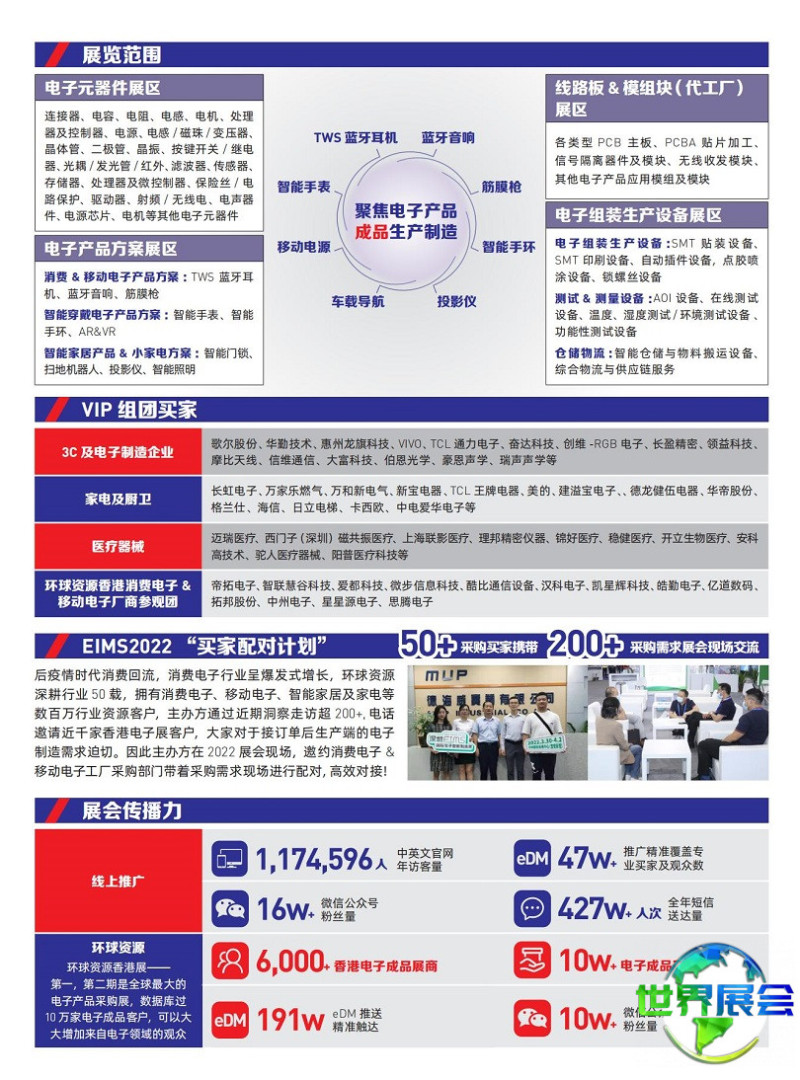 深圳国际电子智能制造展(EIMS)与ITES深圳工业展形成协同效应,聚集电子智能制造产业链各环节企业,携手为华南制造业呈现覆盖工业制造全链条的行业盛会。EIMS亦与全球规模最大的电子产品采购展“香港环球资源电子产品展”同根同源,相互助力,搭建起中外电子元器件贸易往来的通道。