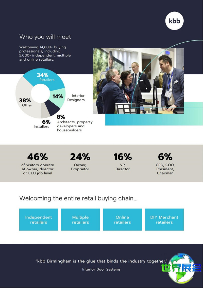 英国伯明翰厨房卫浴博览会(KBB Birmingham)汇聚了全球各地的厨房、卫浴及卧室产品制造商、设计师、经销商与采购商前来参展参观。通过参与KBB展会,参展商与买家能够掌握最新的厨卫卧室设计与制造工艺、市场动态与发展方向,同时也有助于拓展商业渠道与市场,与行业内的专业人士及合作伙伴建立联系并开展协作。