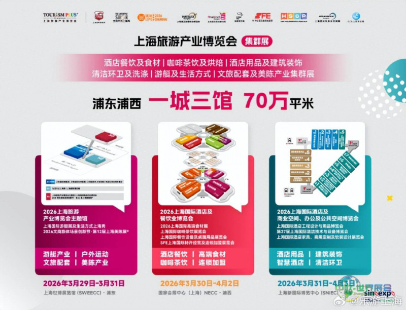 自2026年3月29日至4月3日,本届上海旅游产业博览会将以五大集群展览的模式,依次在上海世博展览馆、国家会展中心(上海)以及上海新国际博览中心三大场馆拉开帷幕。