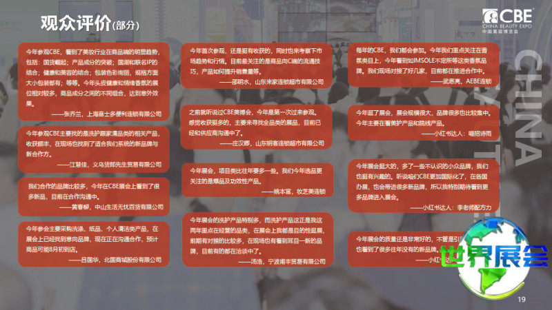 专业线展区:专业美容产品/高端美容品、美容仪器及设备、美甲美睫纹绣服务、牙齿及眼部护理、国际大健康产品、医疗美容/功效护肤品、皮肤管理及店铺整体输出模式