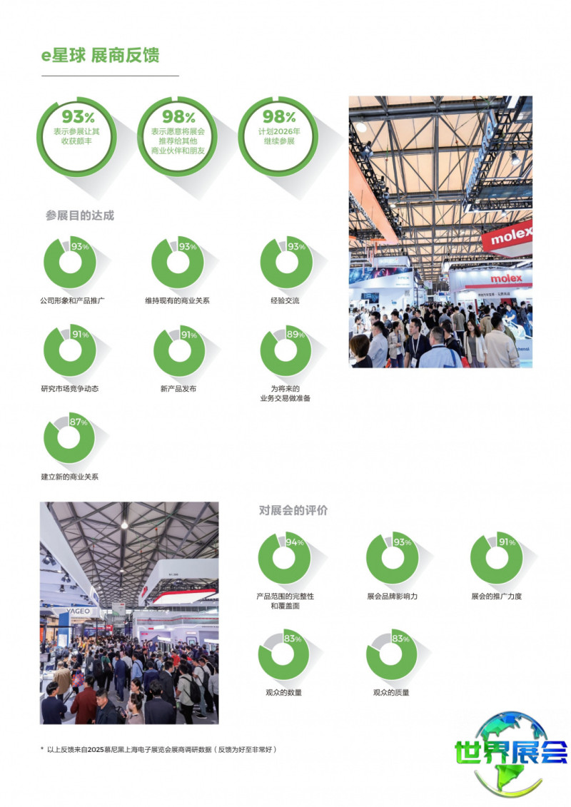 慕尼黑上海电子博览会(electronica China)上一届展出面积达90000平方米,吸引了1568家参展企业,它们分别来自中国台湾、日本、韩国、德国、英国、俄罗斯、巴西、新加坡、迪拜等多个国家和地区,现场接待观众92695人次。