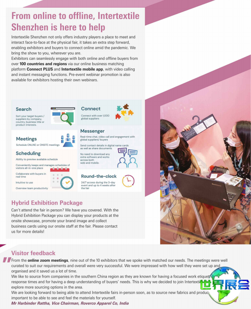 深圳国际纺织面料及辅料博览会(Intertextile Shenzhen)创立至今,始终恪守专业与贸易导向,服务于企业、行业及市场,赢得了参展企业、访客以及业界同仁的广泛赞誉。