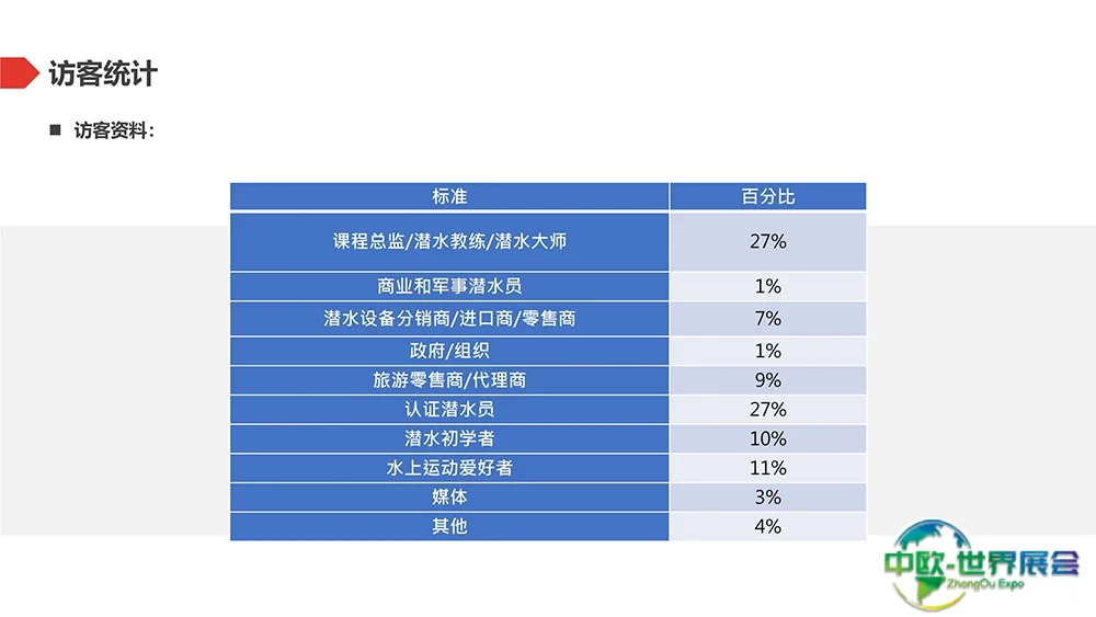 本届展会现场汇聚了专业潜水指导委员会(PADI)、国际专业潜水协会(PSAI)、全球水下探险者组织(GUE)、国际水中运动联合会(CMAS)、世界潜水教练协会(DIWA)、广东省潜水协会等多家专业潜水教学系统及协会单位,提供初阶到进阶的水肺、技术潜水、自潜等课程资讯。