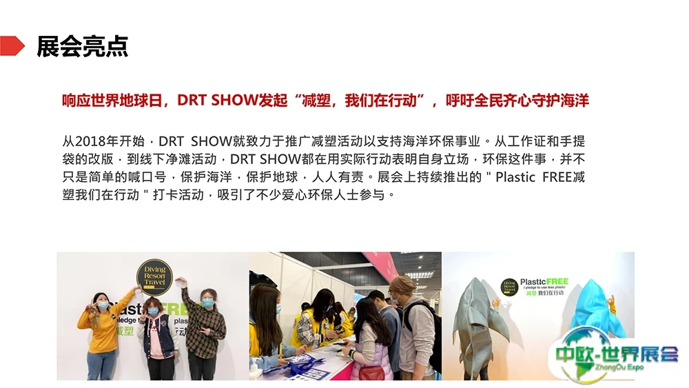 上海国际潜水及度假观光展(DRT SHOW)是亚太地区最大的专业B2B/B2C潜水暨度假观光展。提供所有最新、最专业、最丰富的潜水行业知识。每年服务超过2500个展位,亦吸引来自全球65个国家及地区超过45万名专业买家及访客参与。