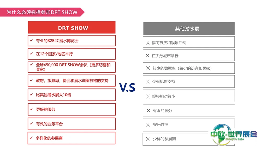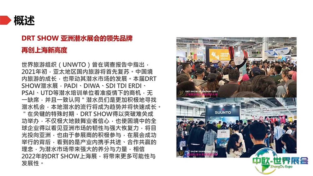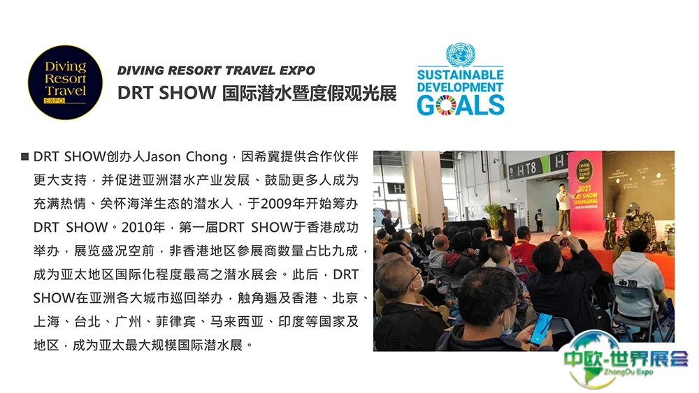 上海国际潜水及度假观光展(DRT SHOW)是亚太地区最大的专业B2B/B2C潜水暨度假观光展。提供所有最新、最专业、最丰富的潜水行业知识。每年服务超过2500个展位,亦吸引来自全球65个国家及地区超过45万名专业买家及访客参与。