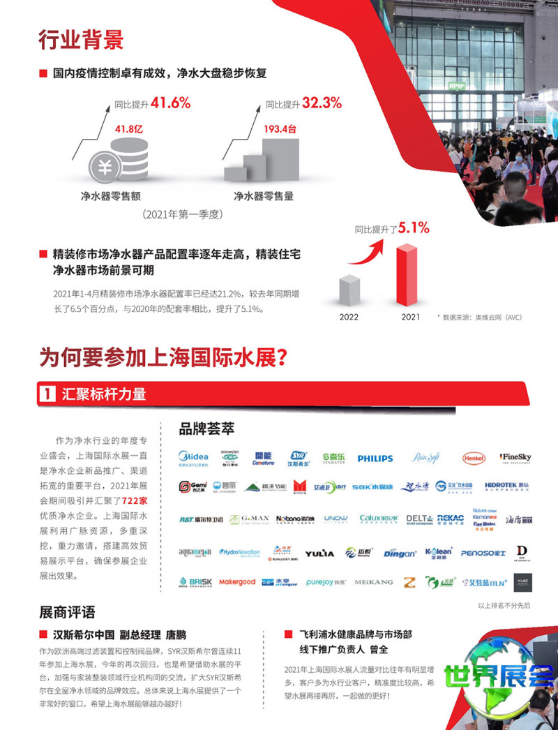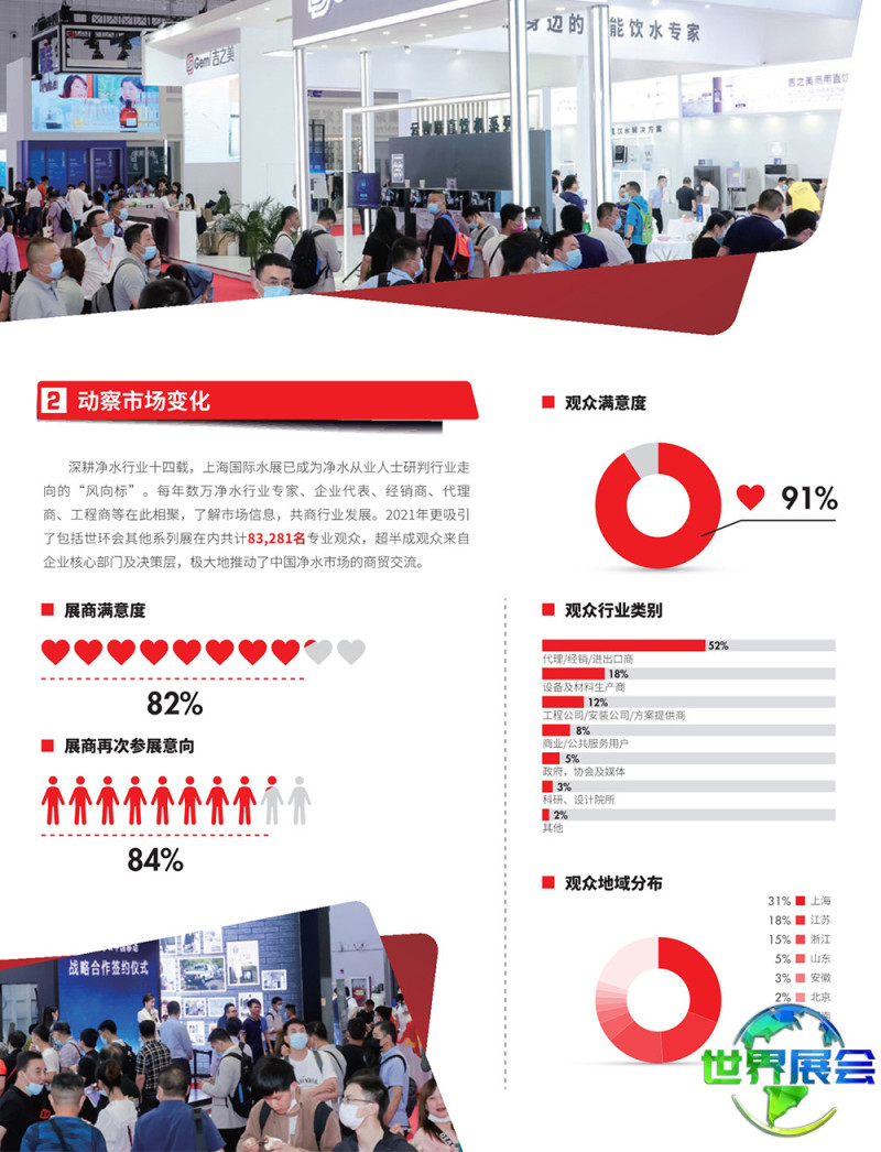 上海国际水展(Watertech)汇聚了全球水处理行业的优质资源,已发展成为该领域全球规模最大的展览盛会。其目标是将传统的市政、民用和工业水处理与环境综合治理及智慧环保相结合,构建具有行业影响力的商业贸易与交流平台。作为行业发展的风向标,上海国际水展不仅彰显其精准对接供需的商业价值,还将扮演全球水处理技术关键展示与交流平台的角色,汇集该领域的最新技术、前沿应用案例与权威专家,为水处理行业人士拓展更广阔、更前沿的行业人脉网络贡献力量。