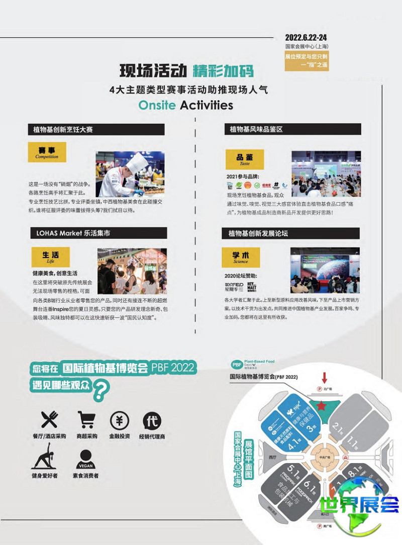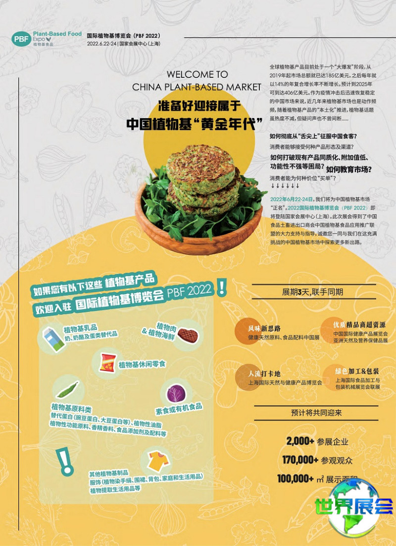 上海国际植物基展览会(PBF)于2022年首度在国家会展中心(上海)亮相。本届展会获得了中国食品土畜进出口商会、中国植物基食品应用推广联盟的鼎力支持与指导,诚挚邀请您共同在充满变局的中国植物基领域探寻新的发展路径。