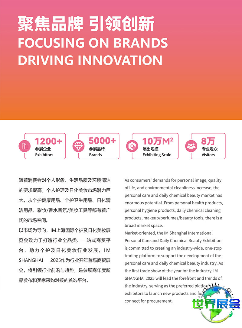 上海国际个人护理及日用化妆品博览会(IM)构建个人护理及日化行业综合性贸易平台。以市场趋势为指引,IM旨在为产业链各环节专业人士提供多元化的商业对接机会,推动个人护理及日化美妆产业进步。IM把握行业潮流与方向,将成为参展企业年度新品亮相和采购商寻觅货源的理想平台。
