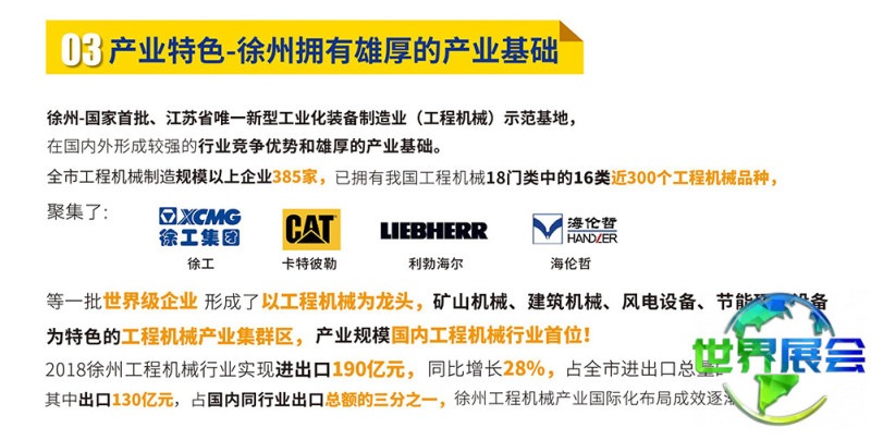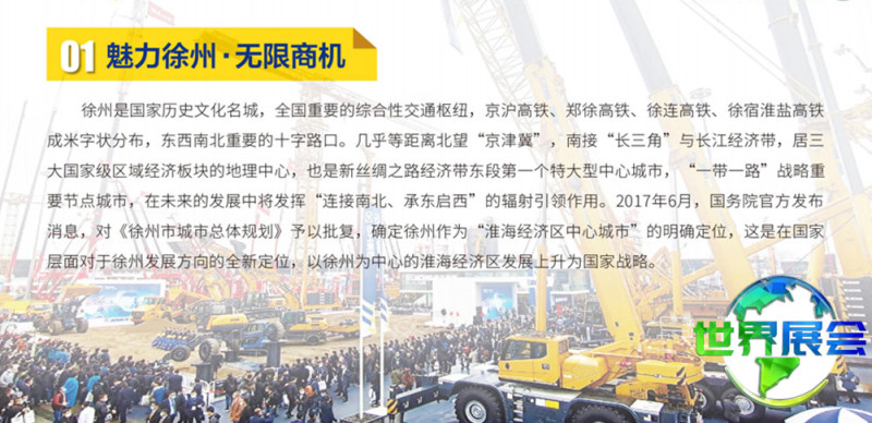 徐州国际工程机械博览会(CHINA XUZHOU)以“起步即与世界同行”为理念,完成了从无到有的突破。秉持“专业化、市场化、品牌化”的办展原则,旨在增强企业创新能力与国际市场竞争力,助力徐州“工程机械产业集群”建设成为世界级的先进制造业集群。