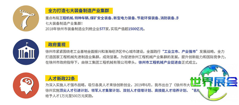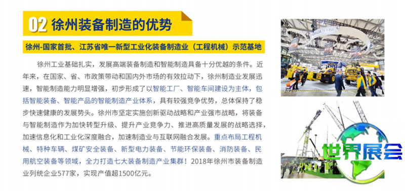 徐州国际工程机械博览会(CHINA XUZHOU)将全面呈现工程机械、建筑机械、矿山机械、施工设备、商用车辆、应急救援装备等各类产品,着重打造品牌推广、工程采购、技术研讨、政策对接四大功能板块。展会将进一步推动行业进步,开拓新兴市场,为政府与企业搭建集投资、建设、运营于一体的综合服务平台,从而提升品牌知名度、企业经济活力与行业持久发展动力。装备制造业是徐州的核心产业,而智能制造对推动该产业升级转型起着关键作用。