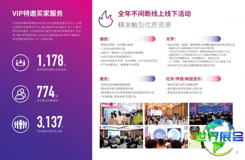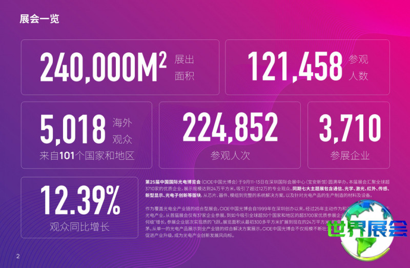 CIOE中国光博会是一个贯穿光电产业上下游的综合性展览,吸引了全球超过30个国家和地区的3800家优秀企业参展。同期举办的八大专题展览,内容涵盖信息通信、精密光学、摄像技术及应用、激光与智能制造、红外紫外技术、智能传感、新型显示、AR/VR、光电子创新等多个光电领域。面向十大应用场景,CIOE中国光博会致力于构建一个融合商业对接、国际交流与品牌推广的专业平台,为企业开拓全球市场提供助力。