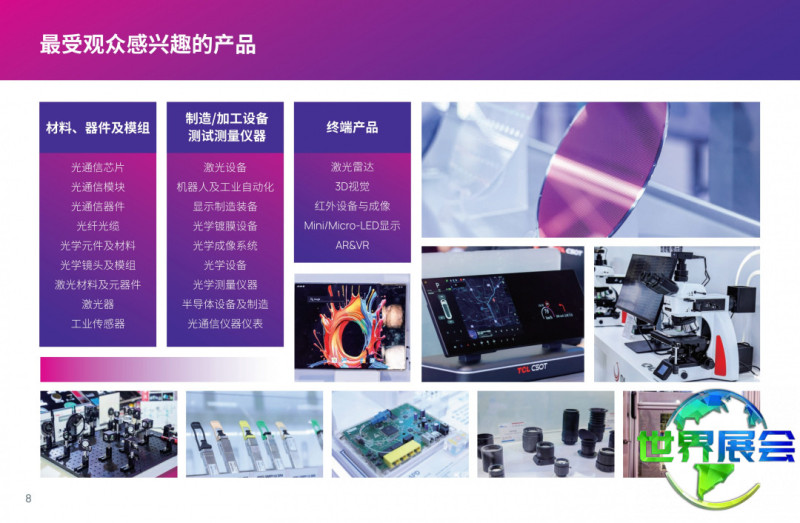 信息通信展区:光通信芯片、光组件、光通信器件、光通信模块、光通信传输设备、光通信数据中心设备、广电通信设备、无线通信、光纤材料、光纤光缆/光纤传感、配线产品、电线电缆、线缆生产设备、仪器仪表、半导体材料、半导体设备及制造、运营与通信服务