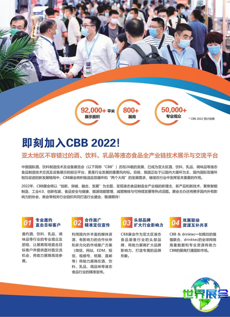 上海国际酒饮料制造技术及设备展览会(CBB)是亚太地区液态食品加工与包装领域规模最大、水准最高、专业性最强且最具权威性与行业风向标意义的国际性品牌盛会。它为行业全景式呈现覆盖酒类、饮料、液态乳品、液态调味品等行业的原料、工艺、包装、贮存、运输等全产业链内容。