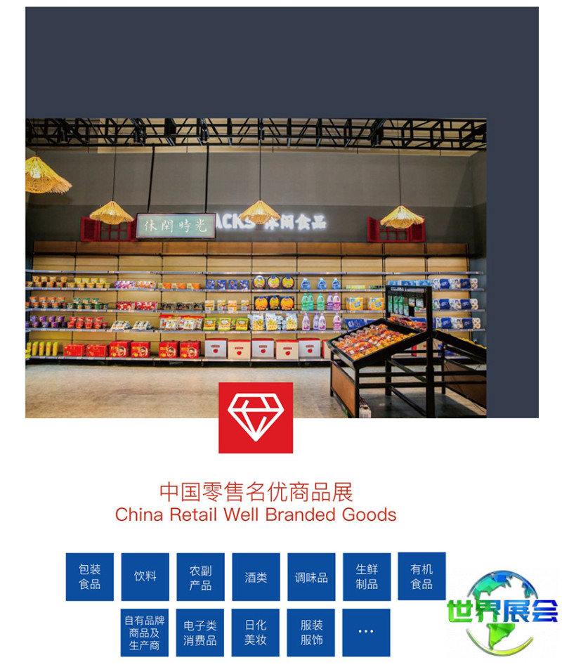 国际零售优质商品展区:包装食品、饮品、农产品、酒类、调味品、生鲜食品、有机食品、自有品牌商品及其生产商、消费电子产品、日用化学品与美妆、服装鞋帽等