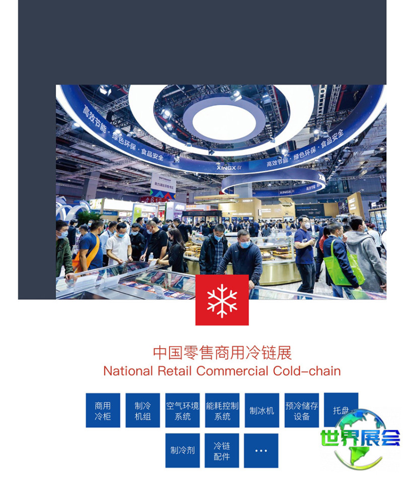 零售商用冷链设备展区:商用冷藏冷冻柜、制冷机组、空气调节系统、能源管理控制系统、制冰设备、预冷与仓储设备、物流托盘、 制冷介质、冷链相关零部件等