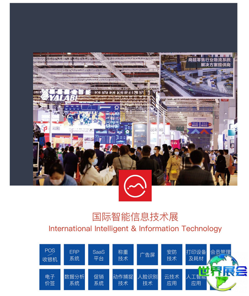 国际智能信息技术展区:POS收银系统、企业资源计划系统、软件即服务平台、称重技术、广告显示屏、安全防范技术、打印设备及耗材、会员管理软件、电子价格标签、数据智能分析系统、促销管理软件、动作感知技术、面部识别技术、云计算应用、人工智能解决方案等