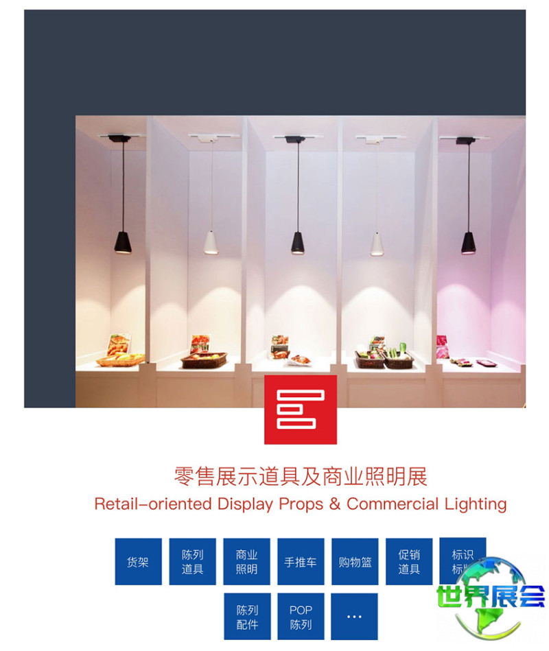 零售陈列道具及商业照明展区:货架、展示道具、商业照明灯具、购物手推车、购物篮、促销用品、标识系统、陈列辅助器材、POP展示物料等