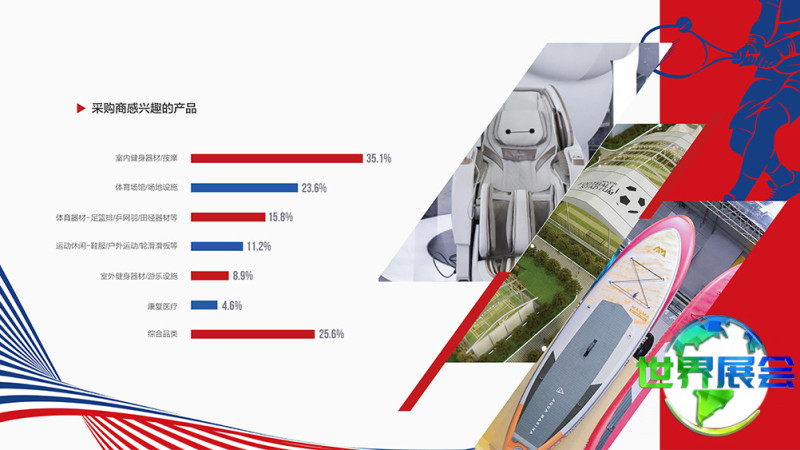 运动场馆设施展区:场馆建设:塑胶跑道、人造草皮、运动地材、塑胶颗粒、树脂涂料、活动看台座椅、坡道设施、篷房及施工铺设设备、防水系统等;体育器械:田径器材、体操器械、篮球架、各类球网柱等;声光电子设备:场馆照明灯具、音响系统、吸音材料、LED显示屏、电子计时器、计分器等;康乐及游乐场设备、泳池设施、电子模拟运动场地;体育场馆检测机构及专业维护设备