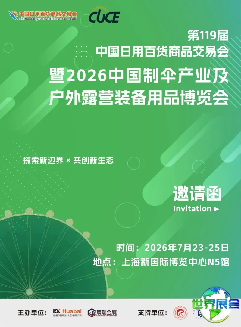 把握产业升级与市场扩大的重要机遇,励展华百展览(北京)有限公司与绍兴宸瑞会展有限公司携手合作,在第119届中国日用百货商品交易会的框架下,隆重推出2026中国制伞产业及户外露营装备用品博览会。凭借专业平台、全产业链资源与精准渠道,全面支持企业进行线下深度拓展与线上业务增长,为雨具和户外产业的商业发展注入全方位动力!