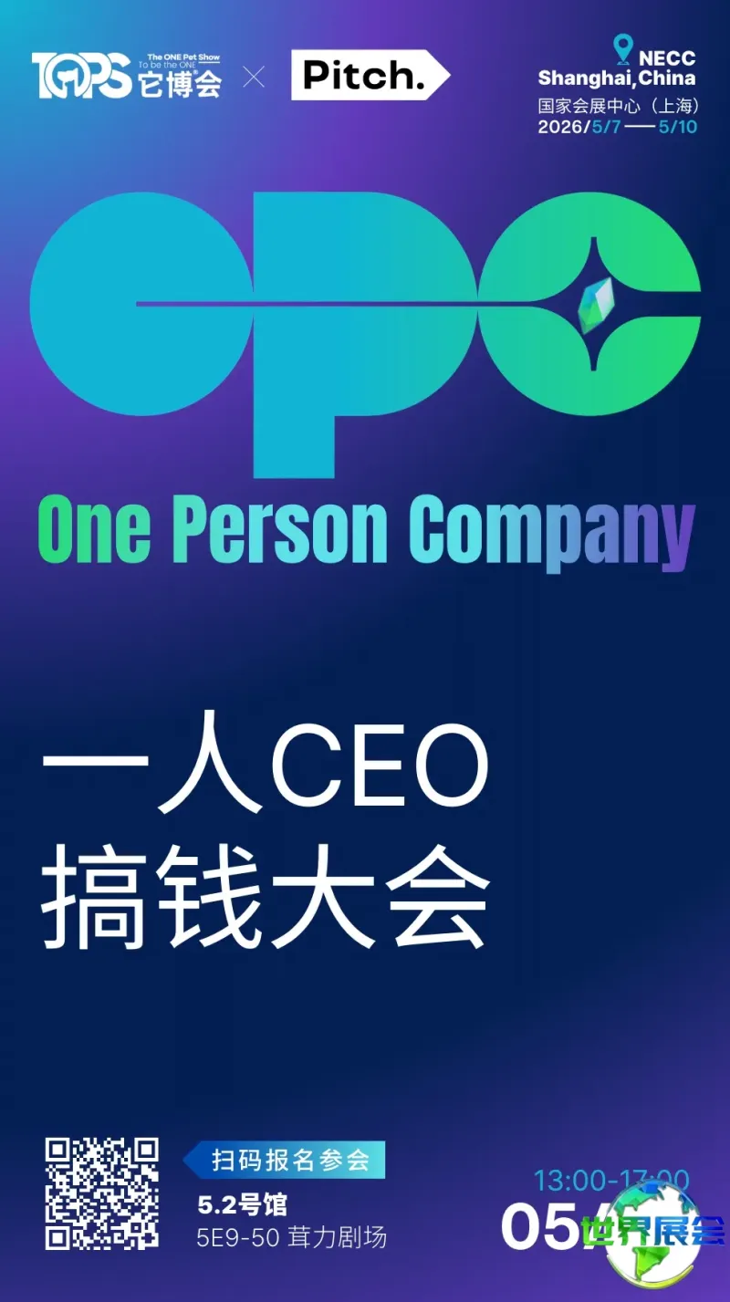 同时,围绕最热门的AI人工智能和OPC一人CEO议题,本届TOPS它博会也联合了更多生态伙伴带来创新内容,将于展会期间与“WAIC人工智能大会”合作举办“2026AI人工智能宠物行业生态大会”(5月7日),并与国内领先的OPC会员制社区Pitch.合作举办“OPC一人CEO创富大会”(5月8日),共同探讨AI时代超级个体如何创造极致价值。