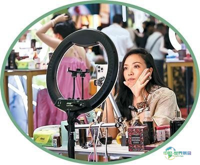 主播在第六届消博会某化妆品展位进行直播推广。新华社记者 高 静摄