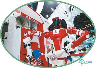在第六届消博会科技消费展区,中国石化展台向观众演示机器人加油服务。新华社记者 高 静摄