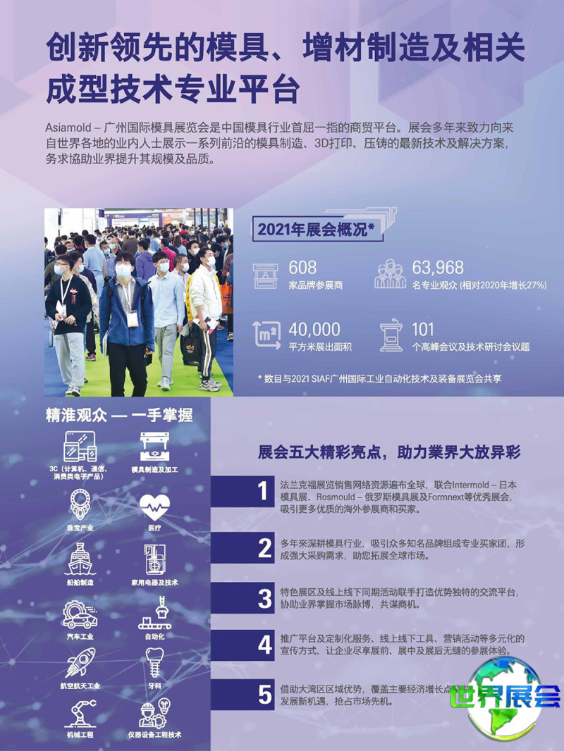 广州国际3D打印展览会(3D Printing Asia)与广州国际模具展览会、SIAF广州国际工业自动化技术及装备展同期举办。展会成功的关键一环是云集业内知名的3D制造企业,全力满足买家的采购需求,全面展示各种3D打印前沿技术及解决方案。