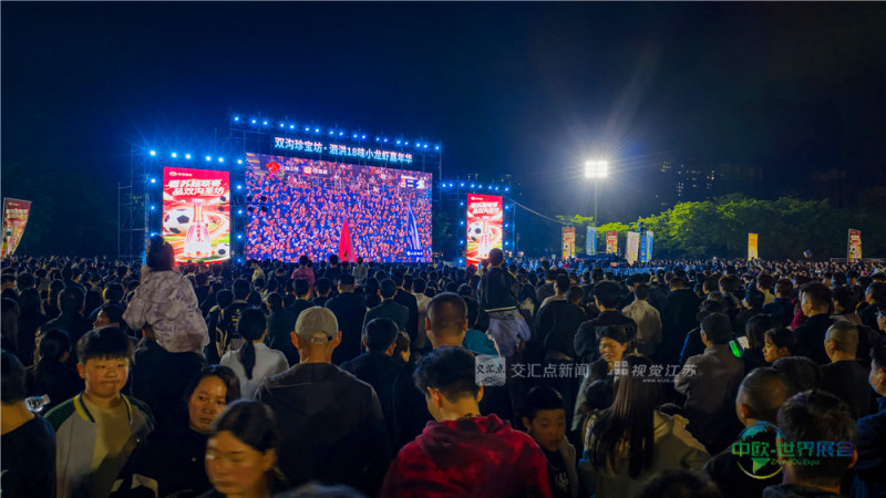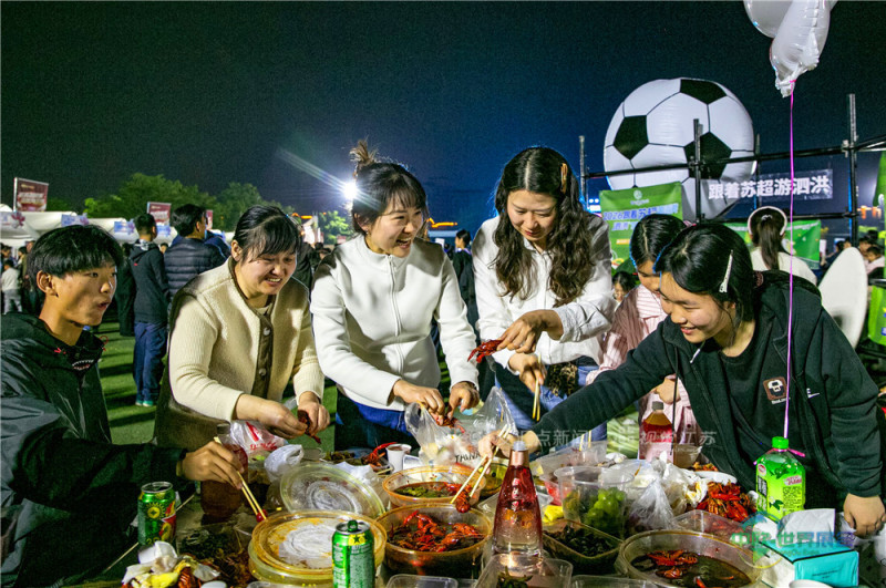 (特约摄影 陈玉 25日20:25摄9:35上线)4月25日,宿迁市泗洪县重岗街道城北生态运动场,万人空巷,市民聚集在大屏幕前观看“苏超”比赛,欣赏文艺演出,品尝龙虾、烧烤等美食。最终宿迁队以0比1负于盐城队。