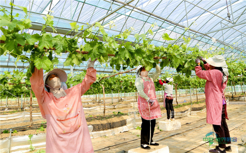 (特约摄影 张格波 9:07摄 11:44上线)4月26日,在江苏省睢宁县梁集镇农业科技示范园,红珊瑚葡萄种植专业合作社的智能连体大棚内,果农正忙着为阳光玫瑰葡萄捆扎果枝、修剪分枝,呈现出一派春日农忙景象。
