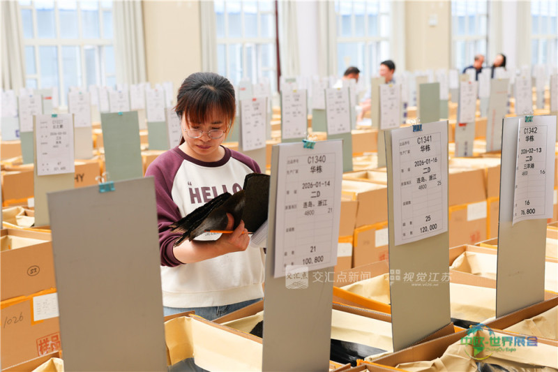 (特约摄影 司伟 10:10摄 11:46上线)4月26日,众多客商在连云港市赣榆紫菜交易中心挑选干紫菜。当天,赣榆区举办了2026年第五轮紫菜交易会,98家紫菜加工企业携136411箱、总计6.53亿张干紫菜参与销售,吸引了海内外客商前来选购和洽谈。