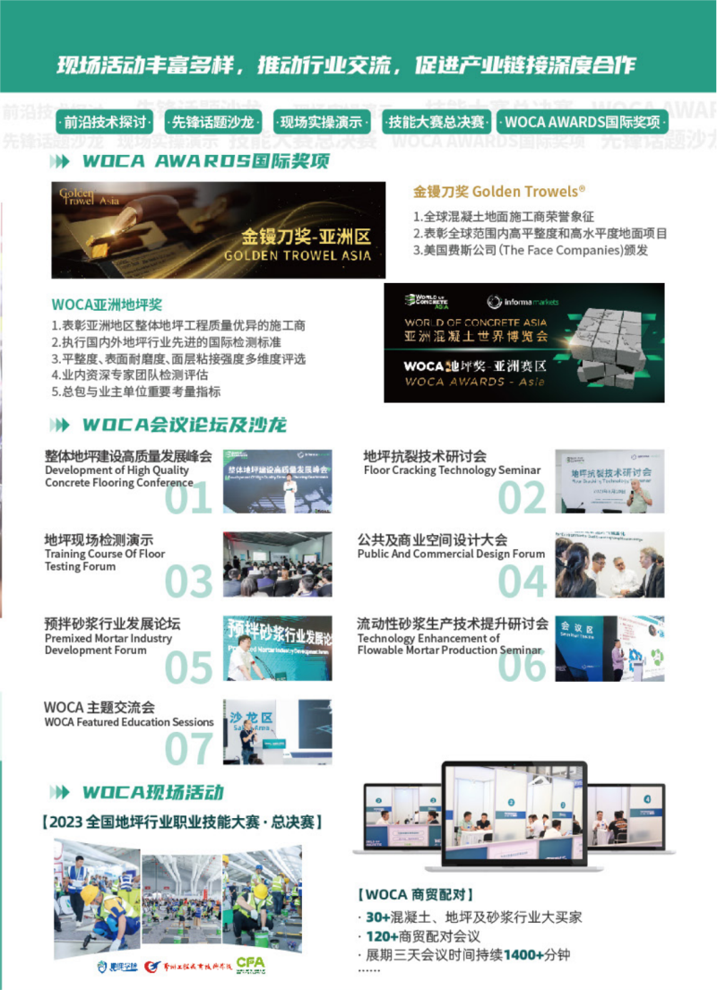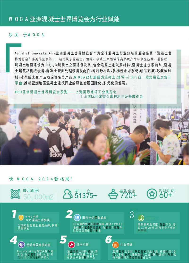 上海亚洲混凝土展览会(World of Concrete Asia)作为全球混凝土行业知名的展会品牌“混凝土世界博览会”系列的亚洲站,一站式展示混凝土、地坪、砂浆三大领域的高品质产品与领先技术。