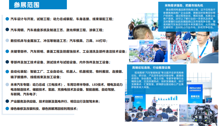 未来汽车专题:动力总成(三电技术)、车用功率半导体、LED技术、车载显示技术、锂电及动力电池制造技术、储能技术、氢能、充换电技术及设备、智能座舱、自动驾驶、车联网、汽车电子;扁线电机智造技术;汽车变速器、电池、电机壳体加工技术;产业服务及供应链、技术创新及氢电并行、明日出行及智驾未来