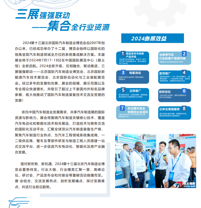 依托中国汽车制造业发展需求,共享汽车制造展的国际资源与影响力。北京国际汽车制造业博览会(BIAME)将围绕汽车制造关键核心技术,覆盖汽车电动化和智能化技术相关展品,打造技术与商务交流的国际化互动平台。汇聚全球顶尖汽车制造装备生产商,聚焦汽车制造行业热点,为汽车工程领域系统集成商、一二级供应商、整车及零部件研发与制造工程人员搭建一站式交流平台,进一步促进汽车电动化、智能化及跨产业融合发展。