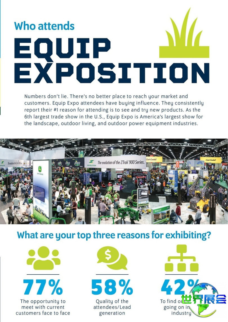 美国路易斯维尔园林机械展览会(equip exposition)以促进中小企业和一流企业交流以及鼓励创新为主题,展示园林绿色工业领域的产品、设备及新技术、新项目。通过行业发展研讨会,为业内人士提供交流学习、合作、洽谈贸易的机会。展会不仅提供了参展企业展示企业形象及产品品牌形象的平台,也力求为不同需求的客户创造商机。