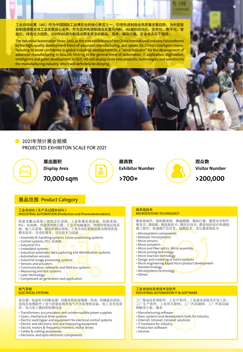 上海国际工业自动化展览会(INDUSTRIAL AUTOMATION SHOW简称:IAS)全面展示生产、过程自动化的最新技术和全面解决方案、电气系统、工业IT与制造业信息化、微系统技术。IAS的展示规模、展品水平和国际影响力在亚洲地区首屈一指。为业内同行提供了商贸采购、企业品牌拓展、交流学习的绝佳平台。
