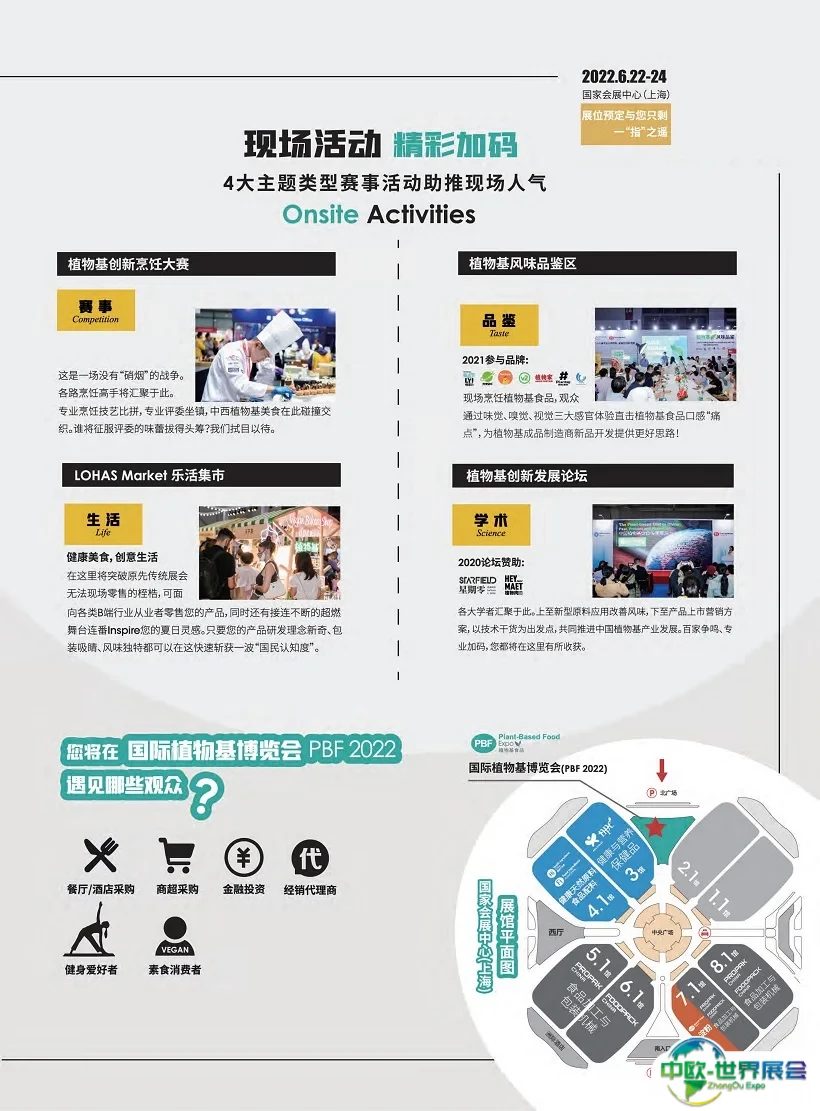 上海国际植物基展 上海国际植物基展(PBF)2022年首次登陆国家会展中心(上海)。此次展会得到了中国食品土畜进出口商会、中国植物基食品应用推广联盟的大力支持与指导,诚邀您一同与我们在这充满挑战的中国植物基市场中探索更多新出路。