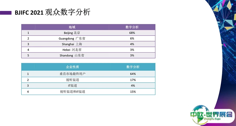 北京国际视听集成设备与技术展览会(InfoComm China)是中国领先专业视听和信息通信展会。它致力于提高中国专业视听(Pro-AV)和交互体验式通信技术(Experiential Communications)市场的专业水平和知名度,是业内商家、厂商和来自各垂直行业最终用户汇集的首选平台。