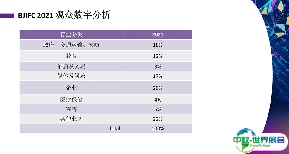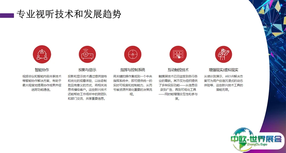 北京国际视听集成设备与技术展览会(InfoComm China)将呈现多元突破性的智能化视听和集成体验解决方案,覆盖政府、教育、文娱、智慧城市、智慧交通、酒店等超过30个垂直细分市场。参观该展会,即可一次过饱览及探索用于各行业不同场景的视听集成体验方案,助您掌握最新的行业趋势及前沿技术。