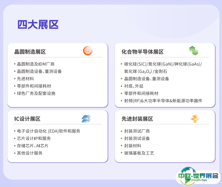 化合物半导体展区:碳化硅(SiC)/氮化镓(GaN)/砷化镓(GaAS)/氧化镓Ga2O3/金刚石、晶圆制造设备、量测设备、衬底、外延、零部件和间接耗材、射频(RF)&大功率半导体&新能源功率器件